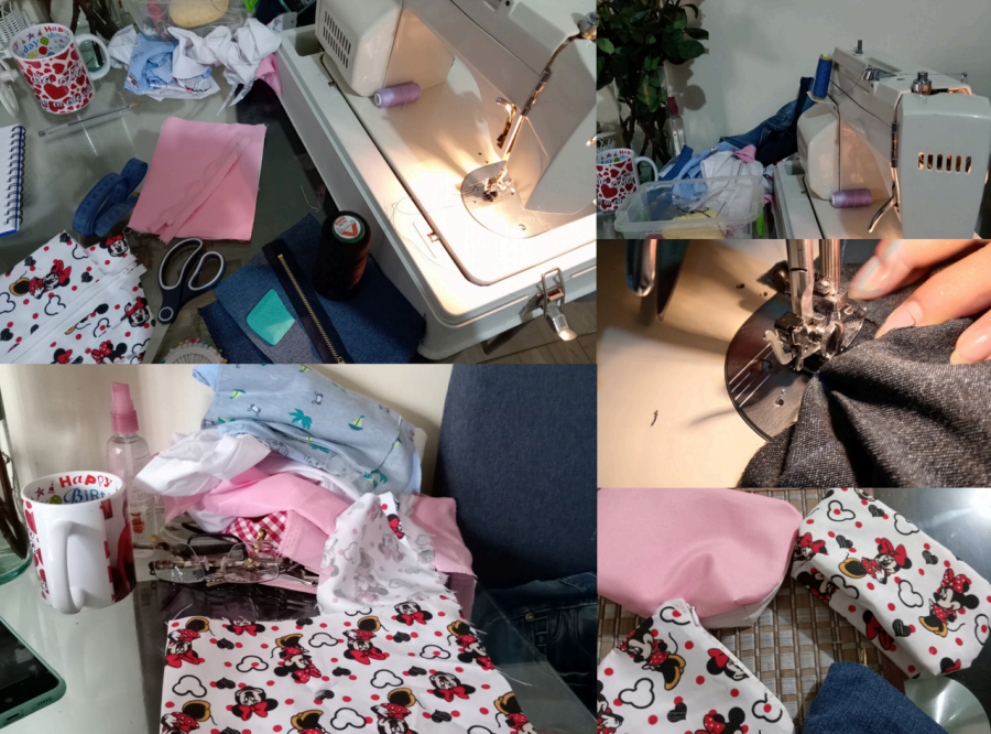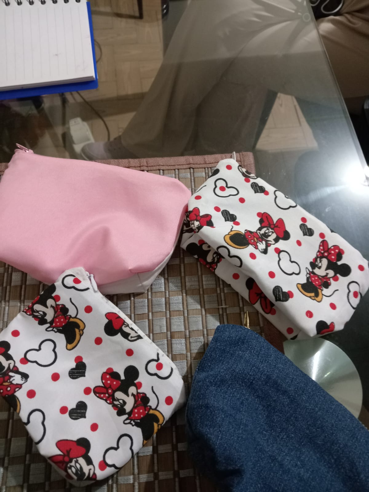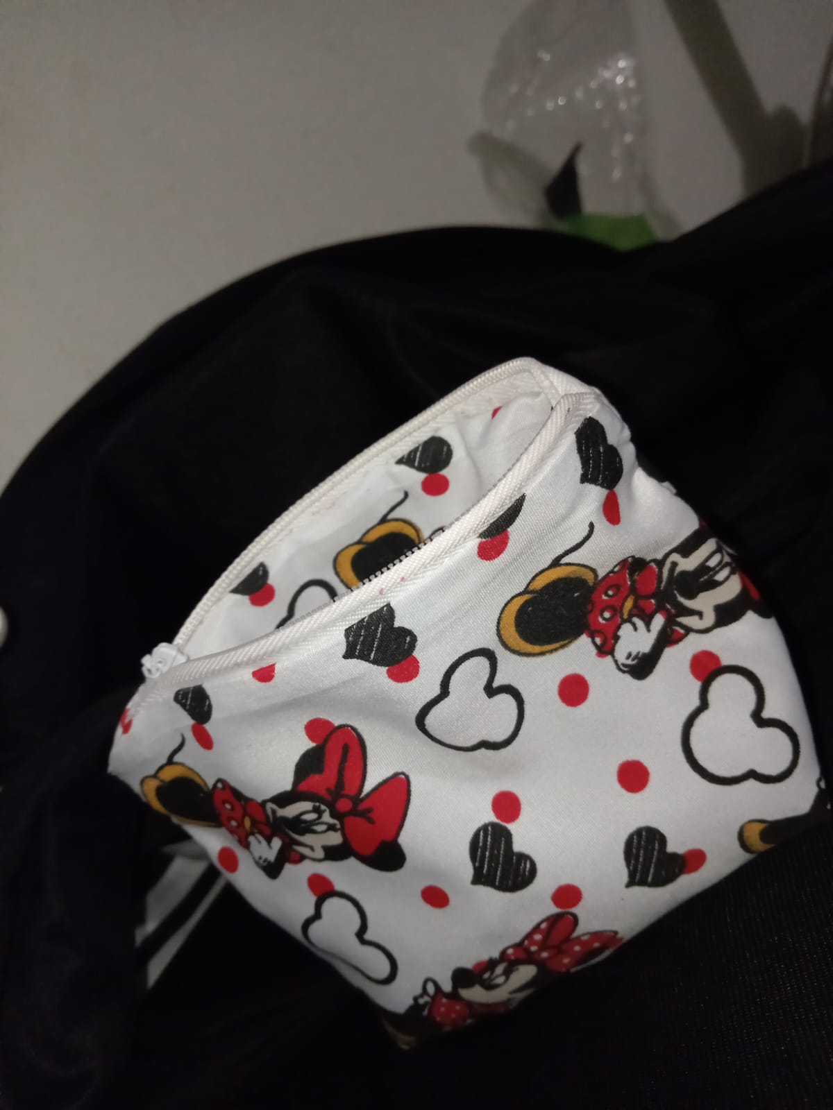 Cartuchera realizada con retazos de tela con impresiones de Minnie mouse, su cremallera es color blanca y tiene un tamaño mediano. Tiene un costo de 10.000