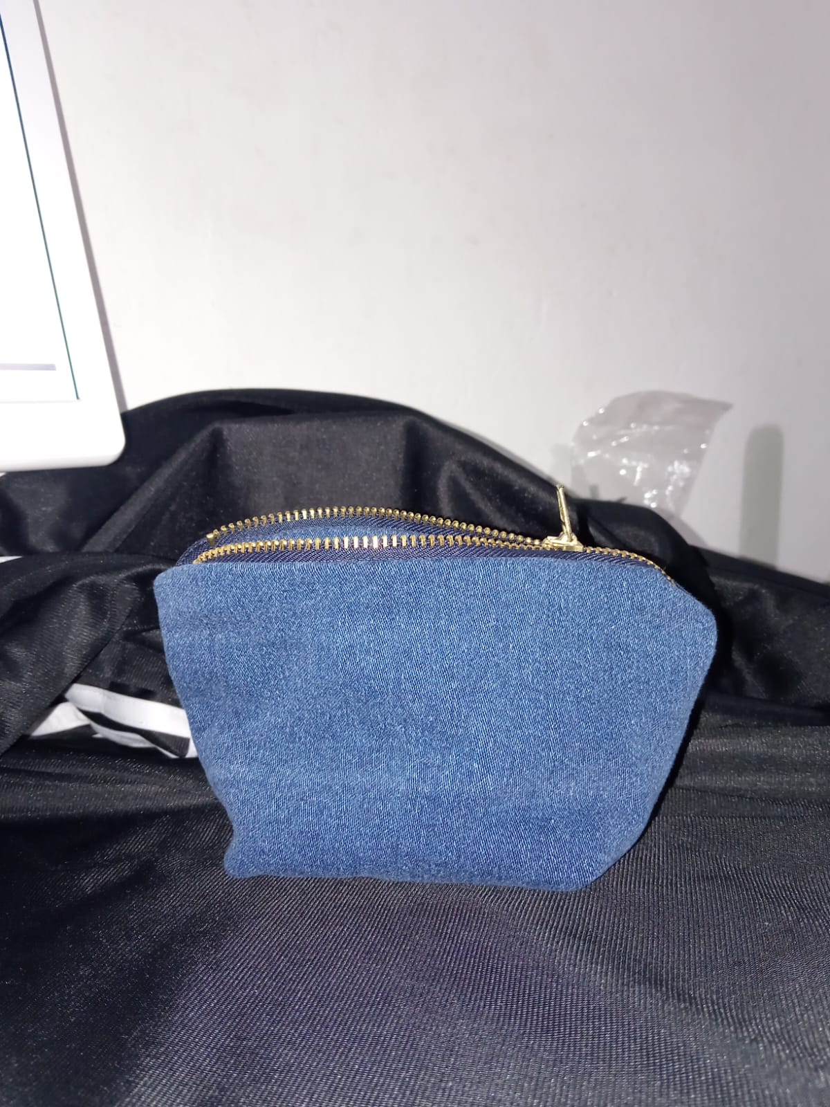 Cartuchera realizada con un jean que ya no se utilizaba color azul rey, con cremallera dorada, tamaño mediano