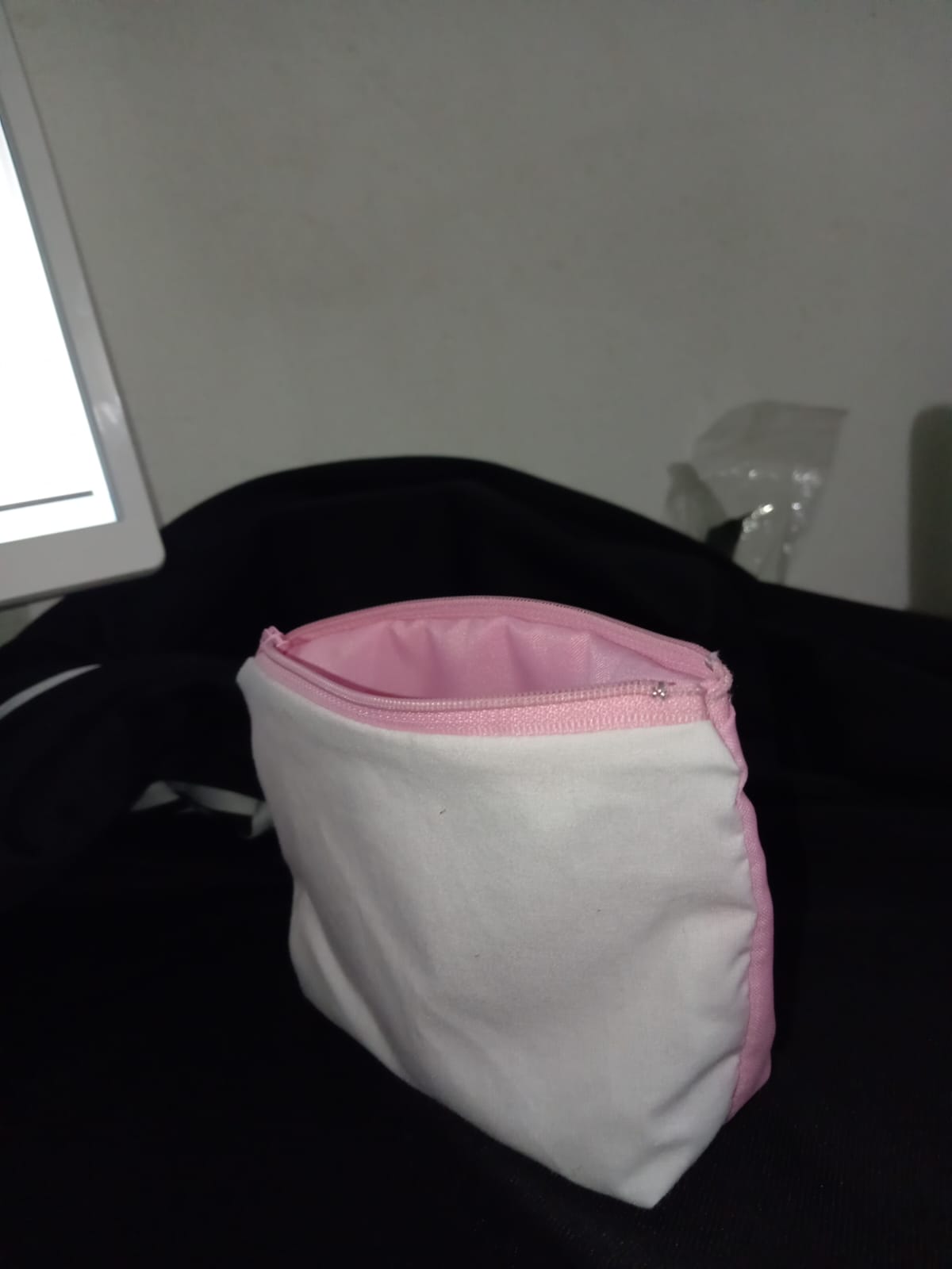 Cartuchera realizada con retazos de una pijama color blanca y rosada, su cremallera es color rosada es una cartuchera grande.