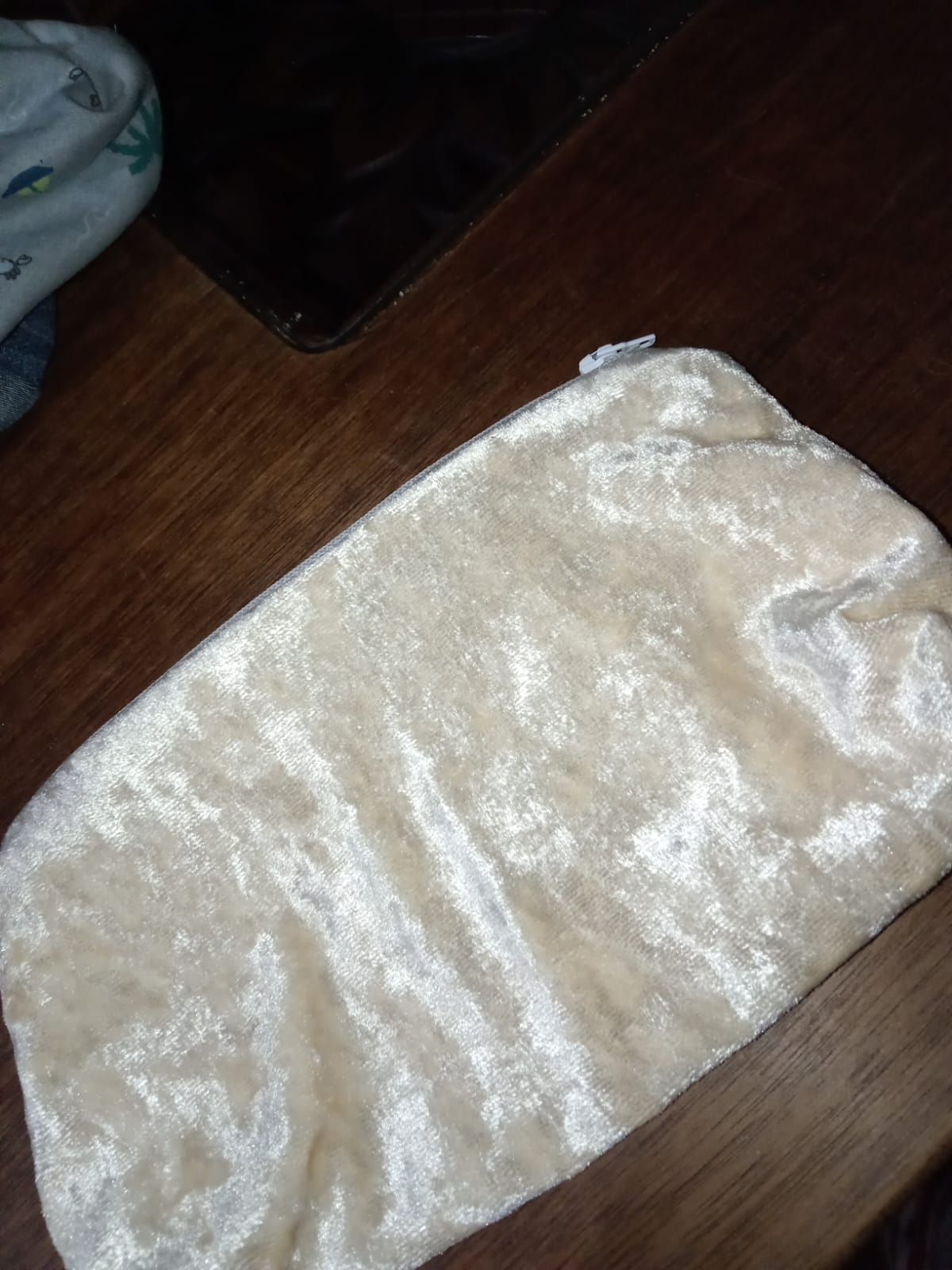Cartuchera realizar con retazos de tela de peluche, su cremallera es color blanca y tiene un tamaño grande, du textura es suave